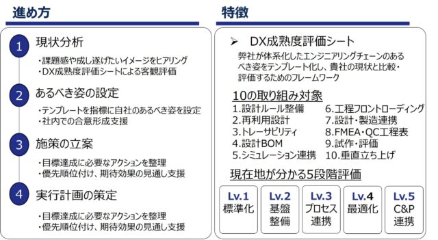 製造業・IT企業での経験の豊富なコンサルタントの英知を結集した「DX成熟度評価シート」を起点に、現状分析、10年後を見据えたあるべき姿の設定、ギャップを埋めるための構想立案を支援します。