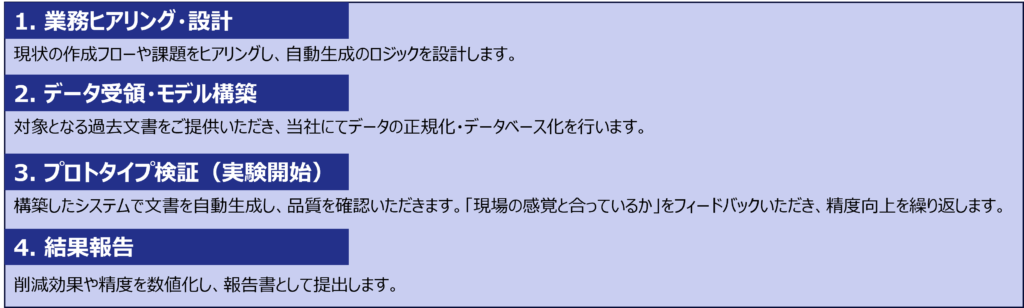 当社独自の「データ整備重視型アプローチ」により、実務で使える精度の高い自動生成環境を構築し、エンジニアが本来の改善業務に集中できる体制作りを支援します。
