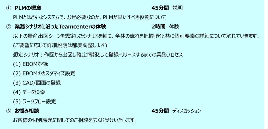 残念ながら、PLMセミナーの多くは概念系の説明となっており、実際にどんなことが良くなるのかが分かりづらく、実機が見れる機会があっても、デモ動画の紹介のみで、いまひとつ自分たちが利用する際の想像がしづらいのが実情です。